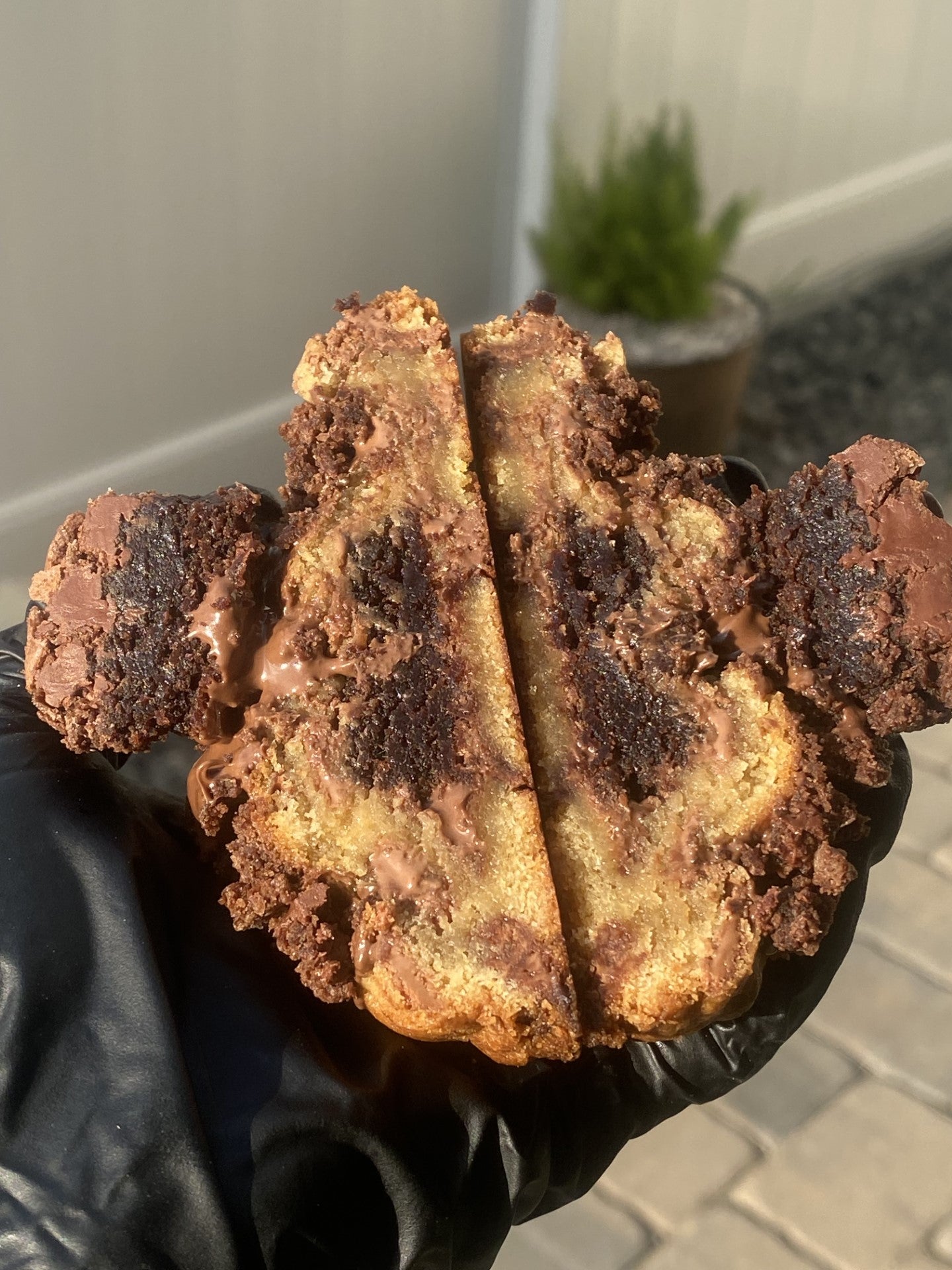 Galleta de chocolate con chips de chocolate rellena con brownie cubierta de nutella
